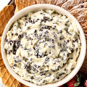 The primary ingredient in Cannoli Dip is ricotta, just like traditional cannoli filling.ย It is then mixed with mascarpone for structure, powdered sugar for sweetness, vanilla extract for flavor and mini chocolate chips for the coveted chocolaty punch.ย It differs from cannoli filling which does not use mascarpone because it has the shell for structure and uses powdered sugar instead of superfine sugar to ensure itโs extra creamy and never grainy.