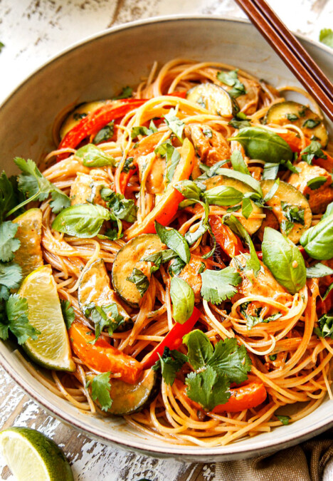 Easy 25 Minute Spicy Thai Pumpkin Noodles (with chicken option) are quick and easy to whip up and smothered in the most tantalizing spicy peanut pumpkin sauce that you will want to make year round!