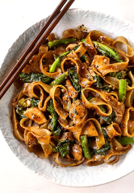stir frying showing how to make Drunken Noodles (Pad Kee Mao) by tossing the wide rice noodles with the sauce