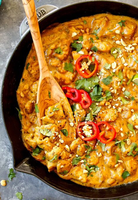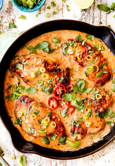 up close top view of creamy coconut curry chicken in a stainless steal skillet