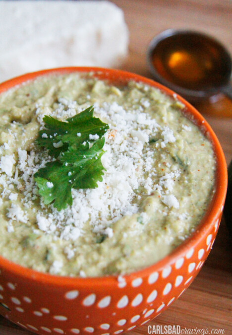 showing how tot make guacamole by tasting guacamole with a tortilla chip
