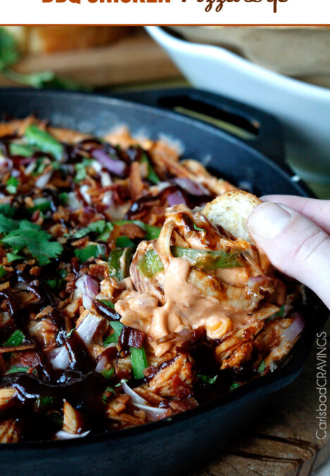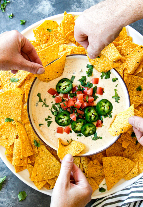 crockpot buffalo chicken dip being scooped up by a tortilla chip showing how creamy it is