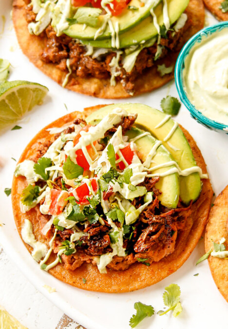 chicken nachos baked in the oven with shredded chicken, cheese and beans then topped with guacamole, sour cream, pico de gallo, olives and jalapenos