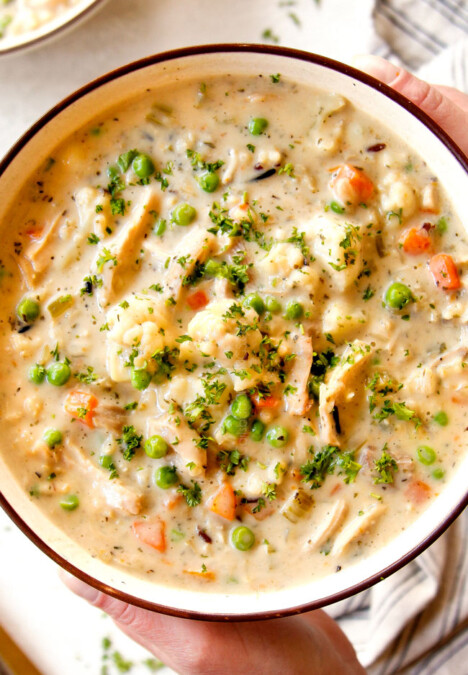 Flavor packed, EASY creamy, cheesy comforting Slow Cooker Bacon Ranch Chicken Chowder is the ultimate comfort soup with NO butter or cream but SO much flavor!! #broccolicheesesoup #chowder #potatosoup