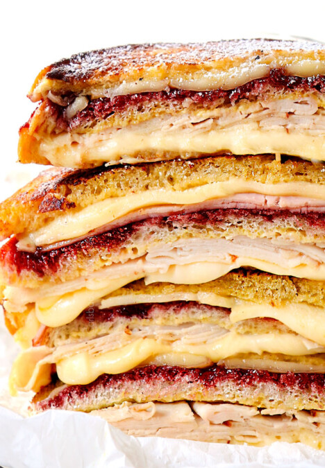 showing the best croque monsieur recipe by stacking the sandwiches cut in half showing the cheesy, creamy inside