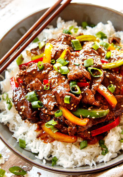 easy Mongolian Beef with Broccoli in a bowl with white rice