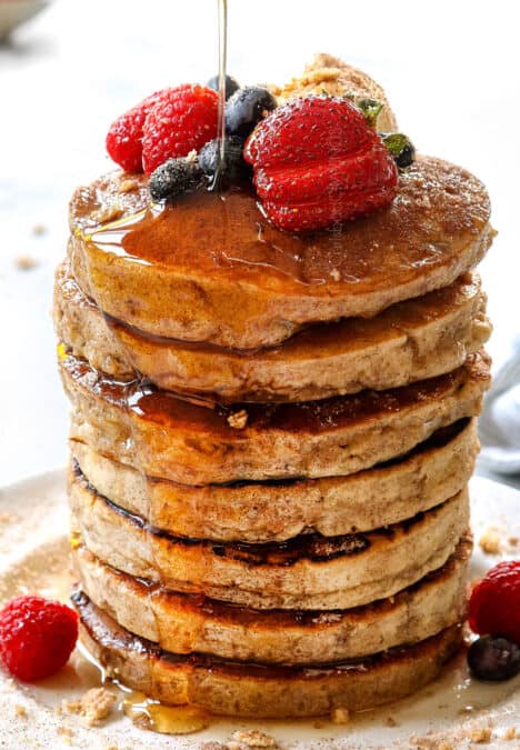 showing how to serve German pancakes by pouring syrup over a slice
