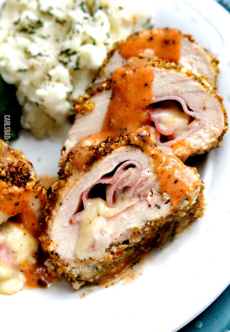 serving baked chicken cordon bleu on a plate with mashed potatoes