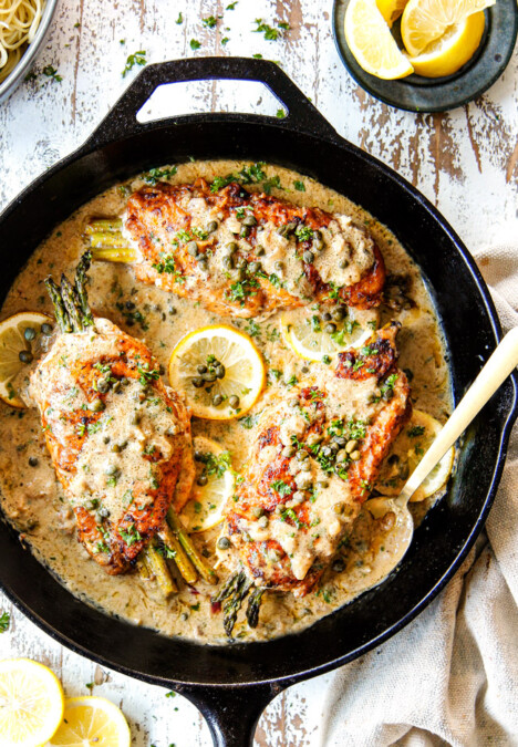 top view of creamy garlic Parmesan chicken in a skillet showing how creamy the Parmesan sauce is