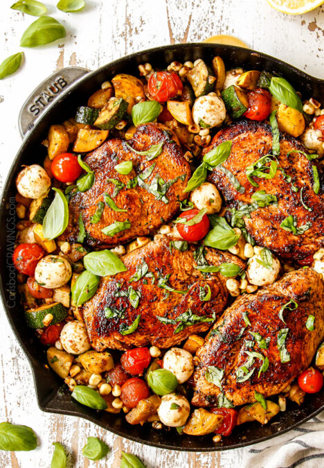up close of chicken caprese recipe being served on a white plate with mozzarella, tomatoes, basil and balsamic reduction (balsamic glaze)