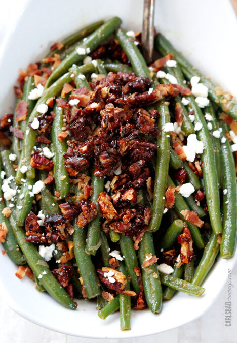 Roasted Green Beans with Cremini Bacon Mushroom Sauce - these beans are amazing! wonderfully flavorful, crisp tender and the silky Cremini Bacon Mushroom Sauce is out of this world! If you are looking for an alternative to green bean casserole, this is it! #thanksgiving