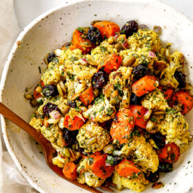 This Cauliflower Salad recipe is not your average mayo salad! Instead, itโs a restaurant worthy, Thanksgiving worthy salad boasting plentiful, caramelized roasted veggies, juicy, sweet craisins, popping red onions and roasted, salted, crunchy pepitas all bathed in an exotic vibrant, garlicky, herb chermoula dressing.ย The end result is hypnotic, satisfying and will keep everyone coming back for more!ย Best of all, this Cauliflower Salad is make ahead friendly to eliminate all that last-minute stress and can last days in the refrigerator.ย Iโve included everything you need to know about how to make Cauliflower Salad, tips and tricks and ways to customize this Cauliflower Salad recipe with veggie swaps and add-ins to make YOUR favorite Cauliflower Salad!