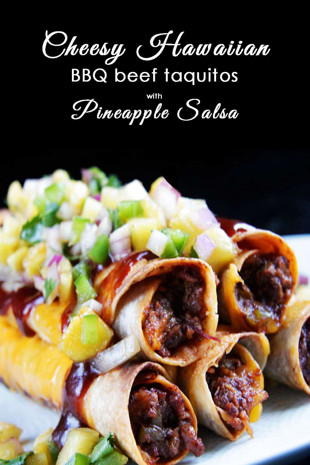 Cheesy Hawaiian BBQ Beef Taquitos with Pineapple Salsa