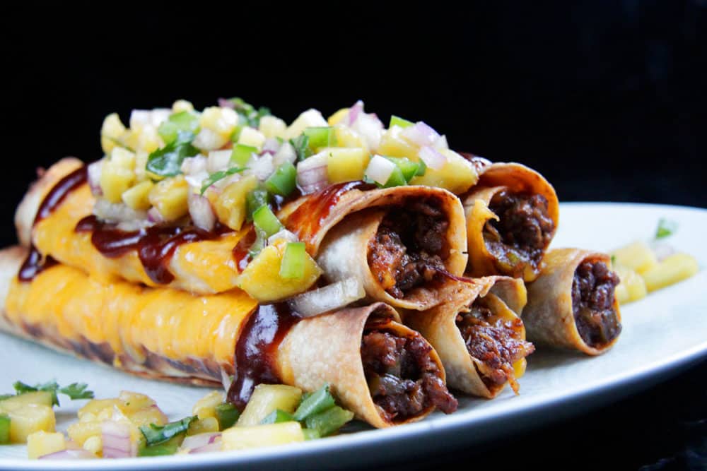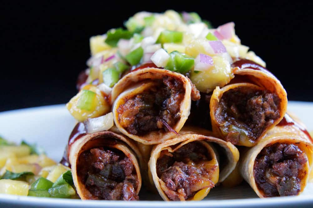 These Beef Taquitos are smothered in spicy, sweet, smoky barbecue sauce, mixed with cheddar cheese, then rolled in a tortilla and broiled to crispy perfection.ย Next, theyโre toppedย with more cheese, barbecue sauce and refreshing pineapple salsa.ย These satisfying beef taquitos can be on your table and in your mouth in less than 30 minutes!