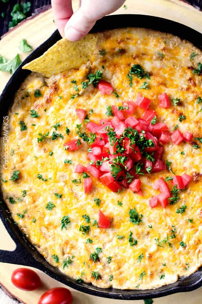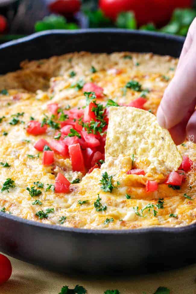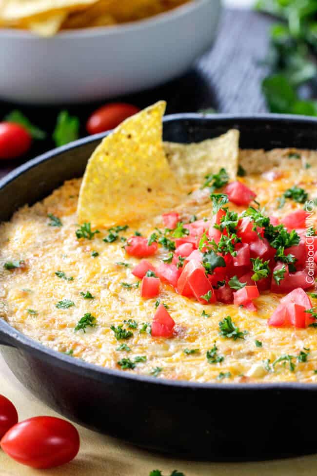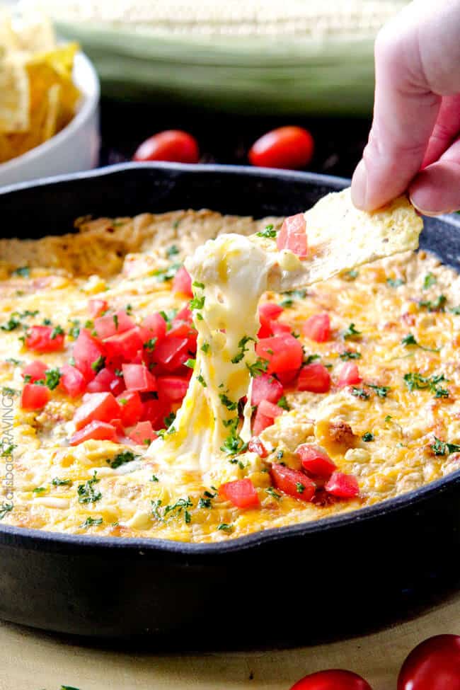 - You can transfer dip to slow cooker to keep warm for 2 hours or serve immediately. Garnish with fresh cilantro and chopped tomatoes if desired. Serve with tortilla chips.