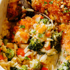 Did you grow up on chicken broccoli rice casserole?!ย Itโs the cousin of my favorite chicken divan casserole but it includes the chicken, broccoli and rice altogether along with carrots and bell peppers.ย This translates into juicy, succulent chicken, tender crispย broccoli, chewy, fluffy rice blanketed in aย creamyย sauce withย crispyย buttery panko in every bite AKA intoxicating, satisfying and outrageously delicious.