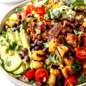 I love Chicken Burrito Bowls for so many reasons, but a huge one is you can customize it with what you have on hand or are in the mood for.ย Most burrito bowl recipes include: