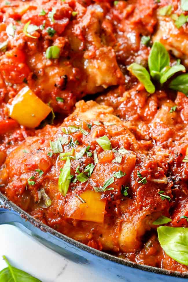 Chicken cacciatore is Italian comfort food at its best. Itโs flavorful, hearty, comforting and easy to make in one pot with pantry friendly ingredients! This chicken cacciatore recipe is made by browning juicy seasoned chicken then slowly braising it with carrots, onions, garlic mushrooms and bell peppers in a rich and hearty tomato sauce infused with herbs and spiked with sassy, salty capers or Kalamata olives. Itโs one of the most satisfying explosions of flavor you will ever sink your teeth into. And the best part is, you can customize the chicken cacciatore recipe to suite your family with different veggies or spices.ย Iโve also included step-by-step photos, tips and tricks to make the best chicken cacciatore of your life!ย Serve this scrumptious recipe with pasta, polenta,ย mashed potatoes, rice or low spaghetti squash, zoodles or cauliflower mash along with someย dinner rolls orย garlic breadย for a comforting dinner the whole family will adore!