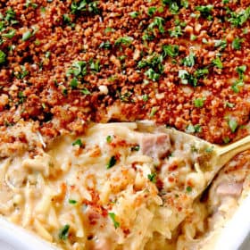 If you love classic chicken cordon bleu, you will love this chicken cordon bleu casserole!ย Itโs made with shredded chicken, chopped ham and tender hash browns enveloped in a flavorful, rich, creamy sauce infused with Swiss Gruyere cheese and topped with buttery, crispy panko breadcrumbs.ย It is decadently delicious and perhaps the most comforting casserole EVER!ย This cheesy chicken cordon bleu casserole is quick and easy to prepare and make head friendly, just assemble then pop it in the oven to bake until warm and bubbly at dinner time OR freeze for later. ย This recipe is a fabulous way to use up leftover ham (or you can use deli ham) and is extremely versatile, add in whatever you want! No matter how you serve it, everyone will be swooning over this lavish creamy, cheesy, comforting chicken and ham casserole!