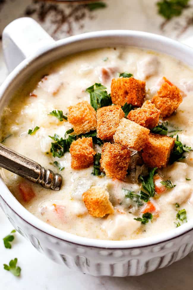 - Croutons:ย The croutons are optional but highly recommended.ย They are so tantalizing all on their own, it was hard to leave any for the soup!ย The croutons imitate the breading on Chicken Cordon Bleu and add a splendid contrasting crunch.