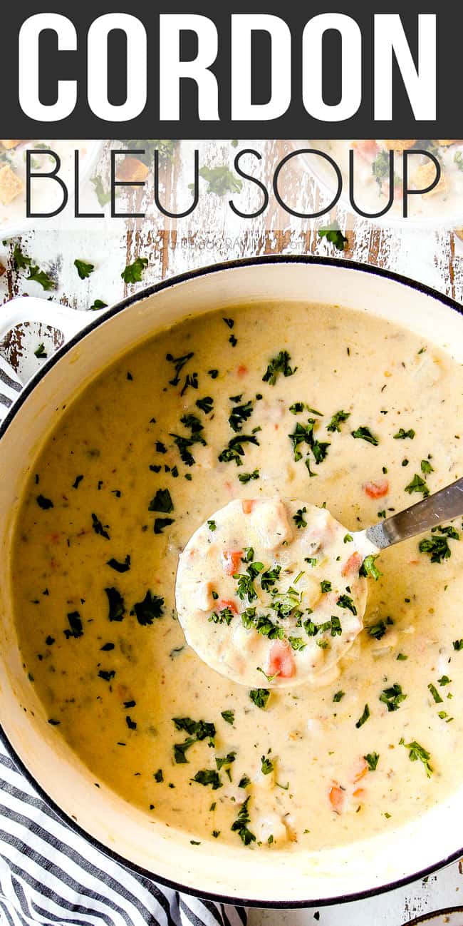 Chicken Cordon Bleu Soup is your favorite entrรฉe all wrapped up in creamy soup form without all the tedious layering or rolling!