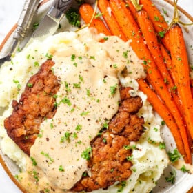 Chicken fried steak, also known as country fried steak, is a southern favorite thatโs easy to make at home!ย Tenderized beef cutlets are battered in a buttermilk/egg wash and seasoned flour then fried to juicy, golden, crispy, crunchy perfection (that resembles fried chicken), then smothered in a rich and creamy white pepper gravy.ย In this recipe, you also have the option to air fry or bake the steaks with a panko breading that becomes shatteringly crispy! This dizzyingly delicious combo is comfort food at its most crave worthy, ready in under an hour! ย For a classic square meal the whole family will clamor for, serve chicken-fried steak with garlic mashed potatoes and cornbread.ย ย