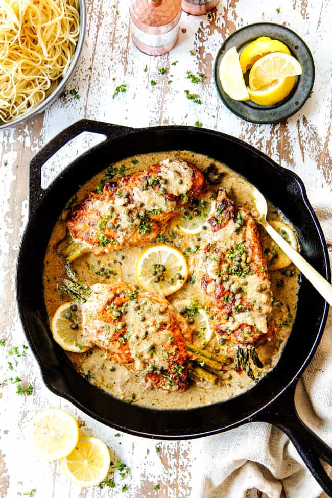 CREAMY SAUCE. ย The lemony sauce is not weak and watery, but delightfully creamy!ย The sauce utilizes heavy cream instead of butter to create luscious body that clings to the tender golden chicken.