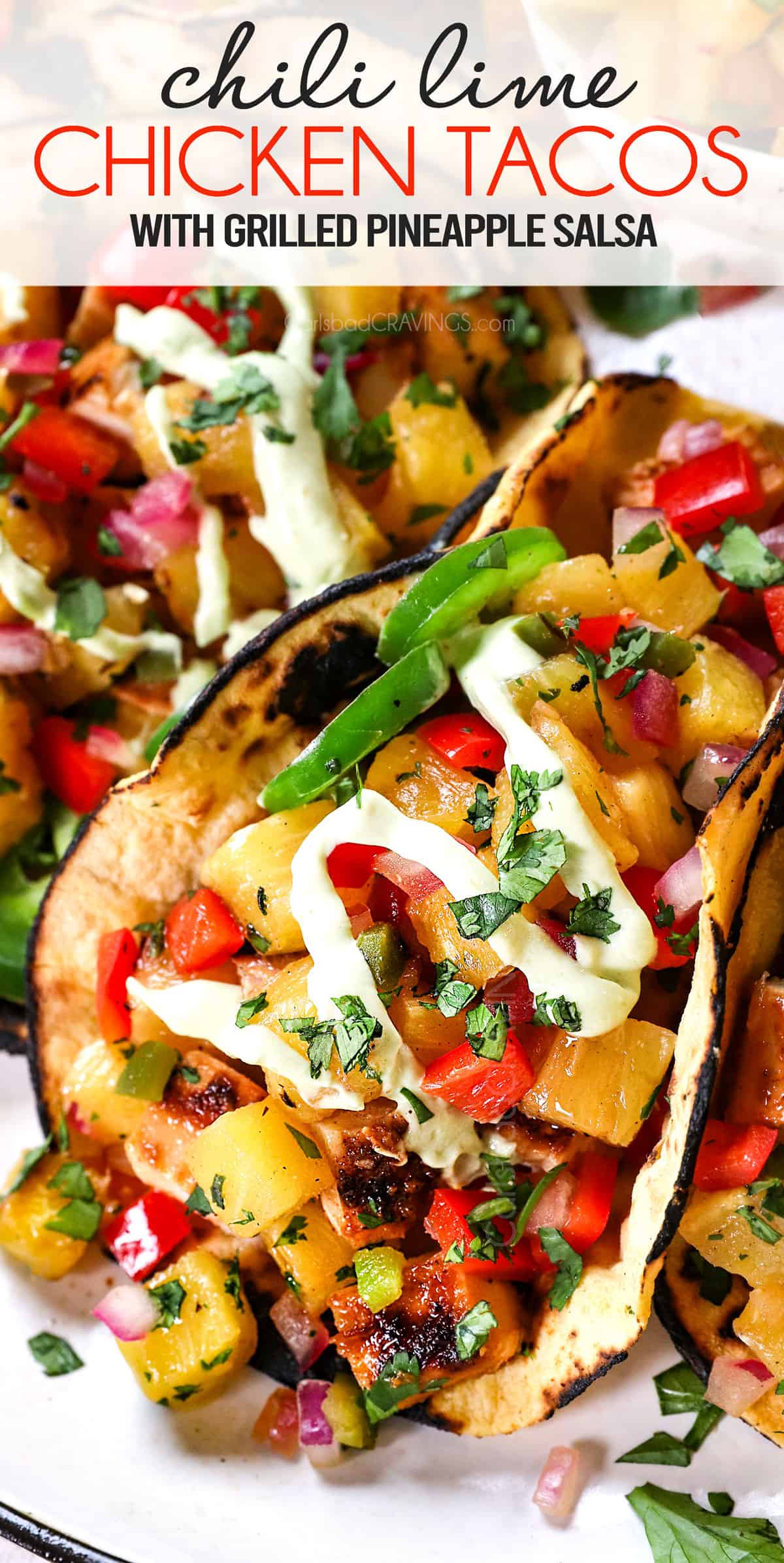 Chili Lime Chicken Tacosย seeping with aย rainbow of chili lime spices, topped with oozing Jack cheese, sweet and smoky Grilled Pineapple Salsa and drizzled with silky Avocado Crema. ย Holiday worthy. ย Every day easy.