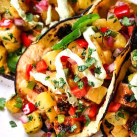 Chicken Tacos seeping with a rainbow of chili lime spices, piled with sweet and smoky Grilled Pineapple Salsa and drizzled with silky Avocado Crema might just become your favorite chicken taco recipe EVER! Readers call them: “absurdly good!,” “mouth watering!!” “AMAZING!” and “hands down the best tacos I’ve ever made and definitely some of the best tacos I’ve ever had.“
