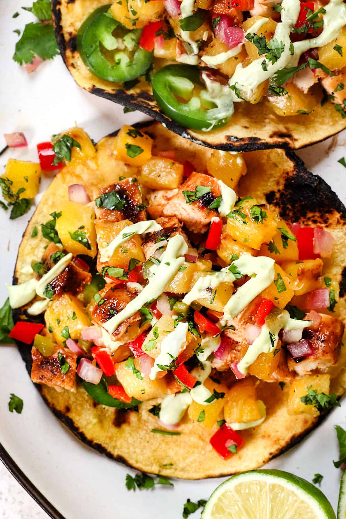 Step 5: Assemble. Melt the cheese on the tortillas in the microwave or stovetop then top with Chili Lime Chicken, Pineapple Salsa followed by Avocado Crema. Dig in!