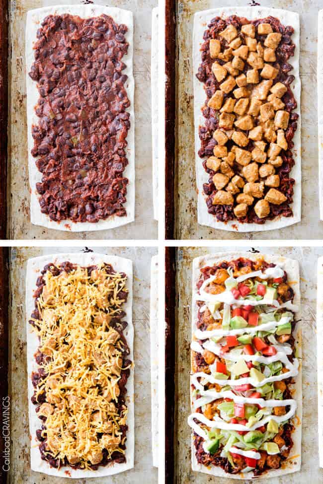 - Remove flatbread and top with Tomato Black Bean Sauce followed by chicken and cheese. Bake 4 more minutes or until cheese is melted. Garnish pizzas with desired toppings such as bacon, tomatoes, lettuce, avocado, tortilla strips, etc. Drizzle with additional ranch.