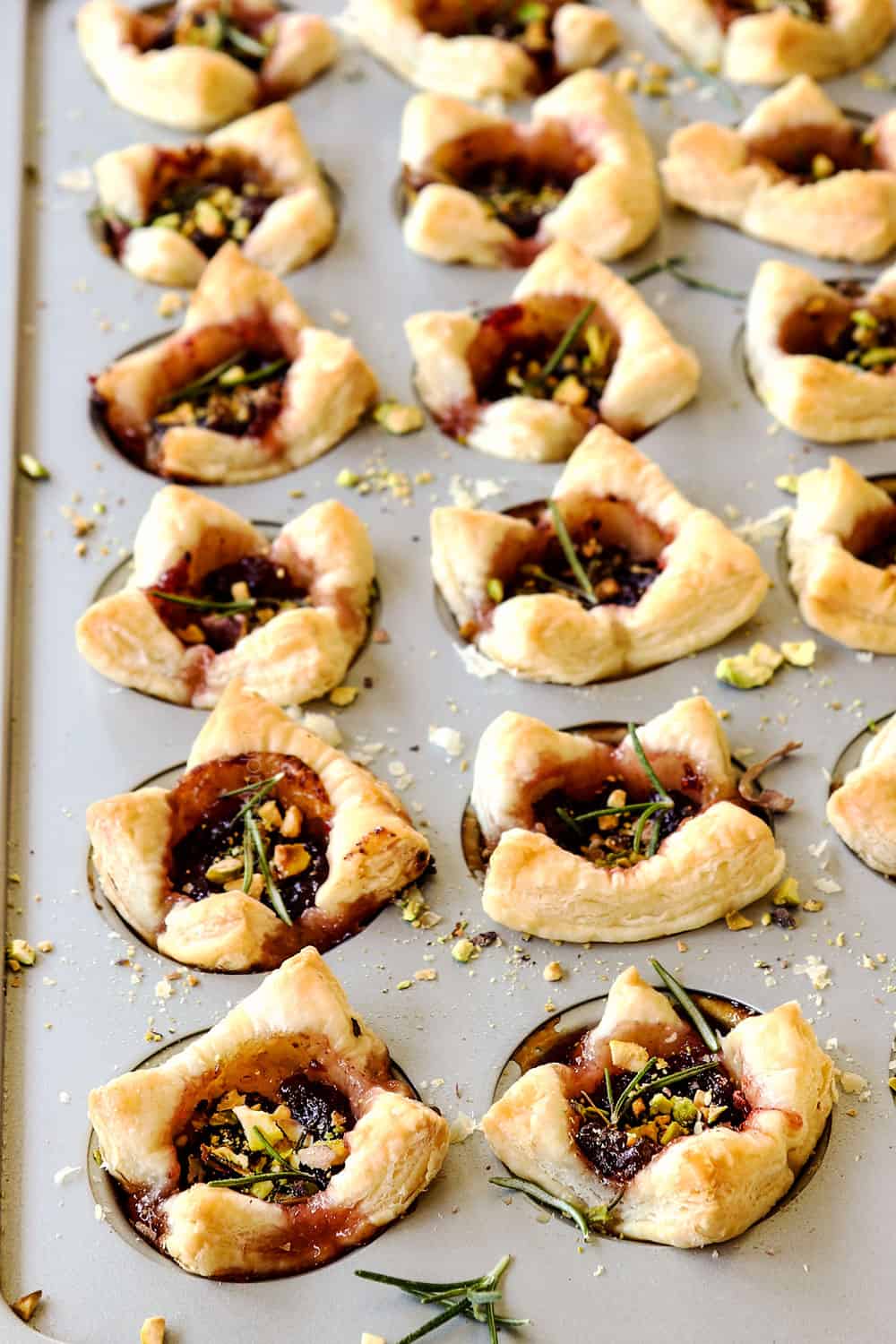 - To bake both pans at once, place one pan in the lower third of the oven and the second pan in the top third and switch positions halfway through baking. To bake one pan at once, place the pan in the middle rack of the oven. Bake for 15-20 minutes at 400 degrees F or until the puff pastry is golden and the cheese is bubbly. Let cool in the pan for 5 minutes before transferring to a serving platter. Garnish with fresh sprigs of rosemary if desired.