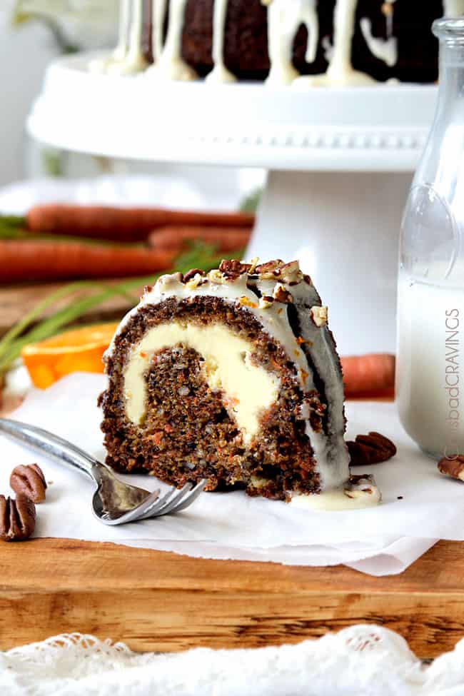 This Carrot Bundt Cake is filled with an irresistible cream cheese filling AND it’s topped with an orange-cream cheese glaze. Perfect for the holidays!