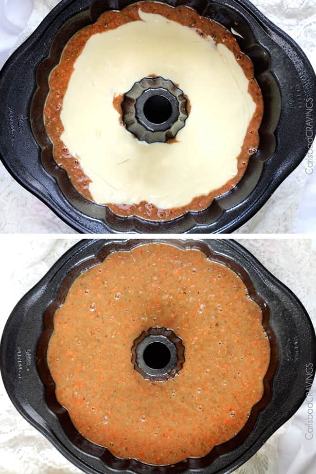 - Assemble the cake. Spoon 3 cups batter into prepared bundt cake pan. Spoon Cream Cheese Filling over batter and gently smooth, but do not touch the sides of the pan. Top with remaining batter.