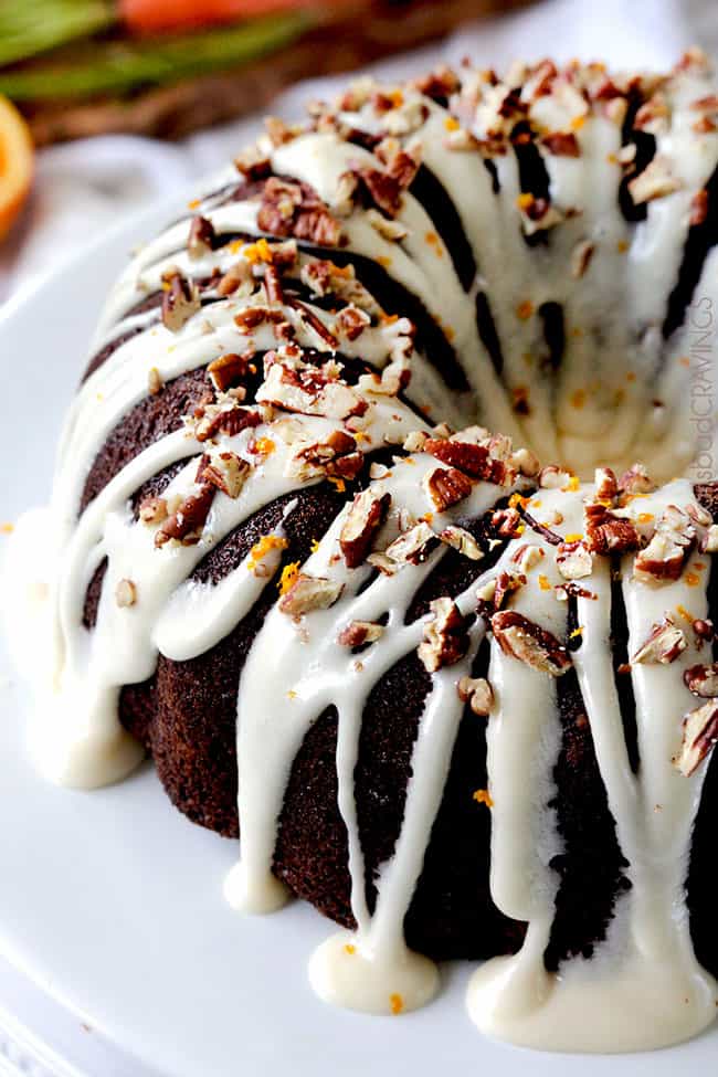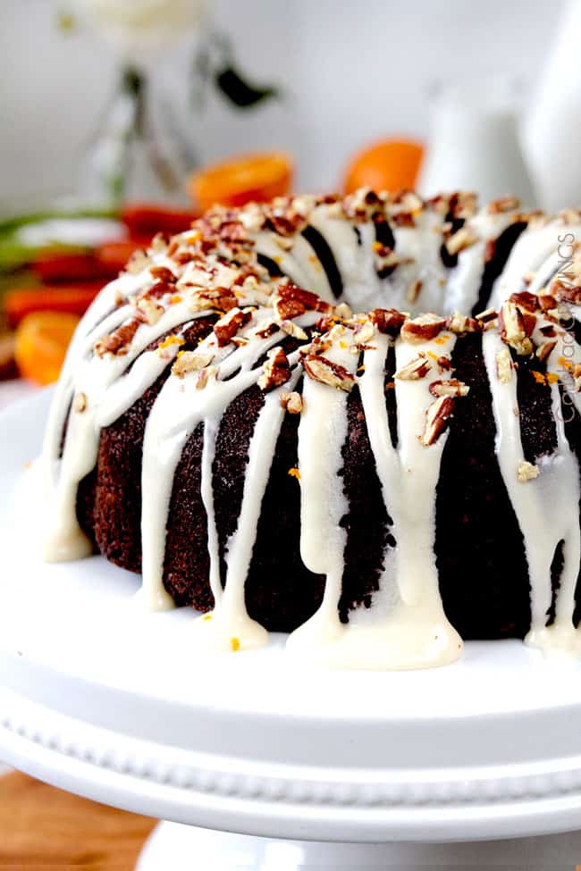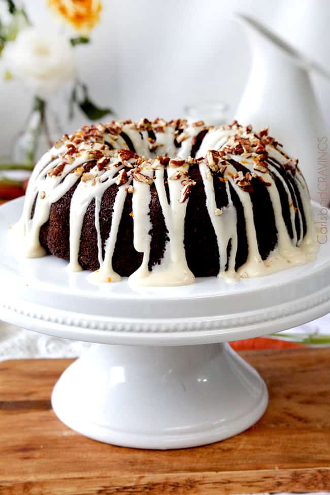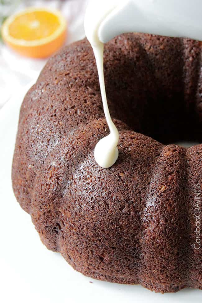 - Glaze. Once the carrot bundt cake has cooled COMPLETELY, whisk together the orange-cream cheese glaze and drizzle liberally over the cake.
