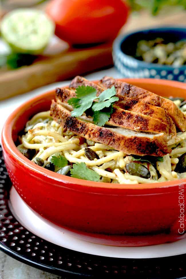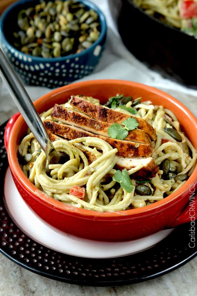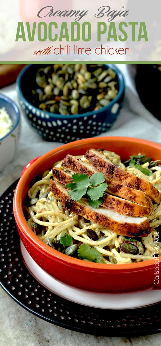 - Add Seasoned Chicken: This Avocado Pasta Sauce Recipe is even more delicious topped with Chilli Lime Chicken. ย Fiestalicious tender chicken packed with flavor from an easy rub of your favorite spices of Baja and brightened by fresh lime juice and lime zest. ย So crave worthy, I gave it its very own post. It makes everything better.ย Of course, the chicken is optional, but to me, this tantalizing juiciness is hardly optional.