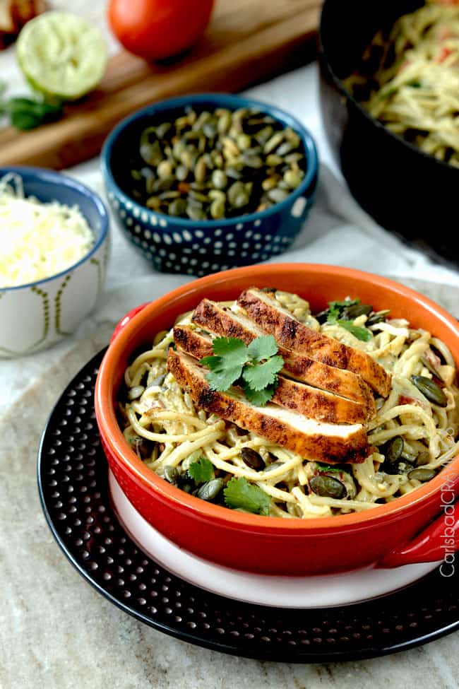 This Avocado Pasta Recipe is sooooo creamy, and sooooo healthy with the Best Avocado Pasta sauce ever!ย This quick and easy Avocado Pasta is completely customizableย โย leave it as simple as you want and slurp up the creaminess or add all sorts of veggies for texture heaven.ย This easy Avocado Pasta is spiced with the flavors of Baja and the option of Chili Lime Chicken, fresh sweet corn, bell peppers and pepitasย โ all on the table in less than 30 minutes!
