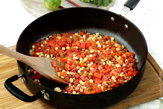 - In the same skillet you cooked your chicken in, heat 1 tablespoon olive oil over medium high heat (you can use remaining oil from chicken if there's enough). Add red bell peppers, corn and garlic and sautรฉ 1-2 minutes, or until red peppers are crisp-tender. Add diced tomatoes/green chilies and heat through.