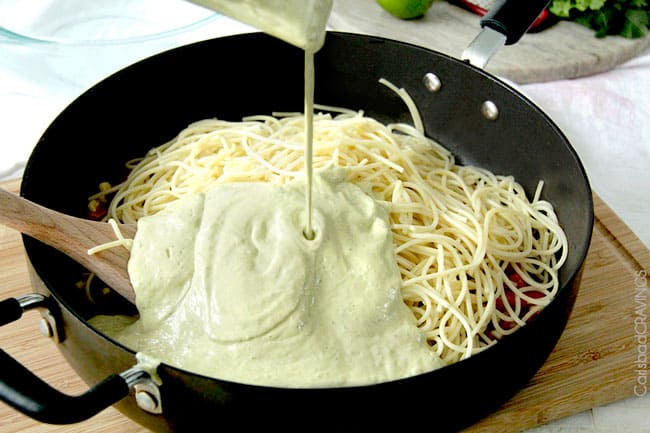 To make the Avocado Pasta, you start by making the Avocado Pasta Sauce.ย Add avocados, sour cream or Greek yogurt, milk, jalapenos, cilantro, lime juice, salt, cumin, pepper and smoked paprika to your blender and blend until smooth.