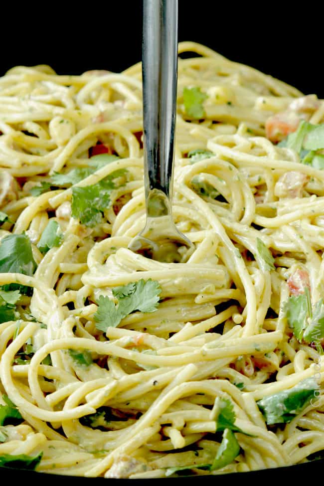 This ย Baja Avocado Pasta is SO thick and creamy without any butter, ย heavy cream or cream cheese. ย So you donโt have to feel bad when you just canโt stop diving in mouth first.