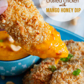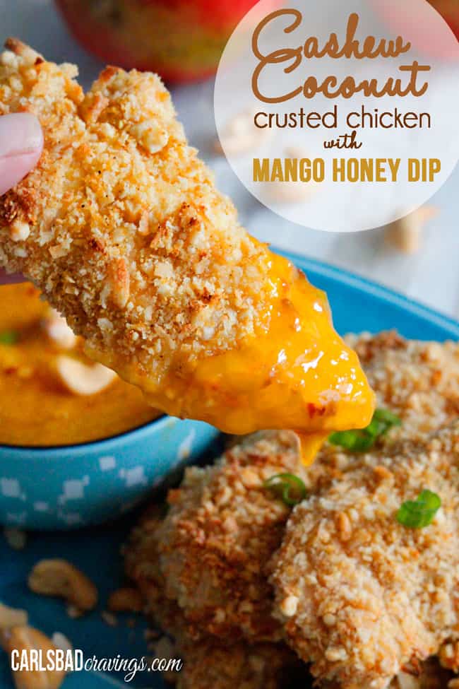 These Baked Coconut Crusted Chicken Tenders arenโt just coconut chicken but CASHEW coconut chicken!ย The chicken is crispy on the outside, juicy on the inside and delicious all over with sweet and spicy Mango Honey Dip!ย ย So be prepared for this Coconutย Crusted Chicken recipe to transport you to the tropics, because coconut + cashews + mango dip = paradise!ย ย Tip and tricks, and freezer instructions included!