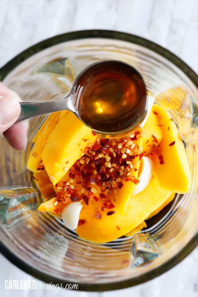 - To make the Mango Honey Dip, place all the ingredients in a blender, starting with just 1 teaspoon red pepper flakes and process until smooth. Taste and add additional red pepper flakes as desired.