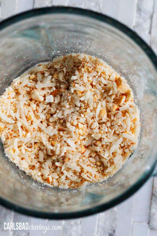 - Process breading.ย Add cashews and coconut flakes to food processor and pulse until the cashews are about the size of the panko crumbs.ย This step is key as the uniform smaller pieces of coconut and cashews adhere better to the chicken and cook more evenly (so the coconut doesnโt burn) to create that tantalizing golden crust.