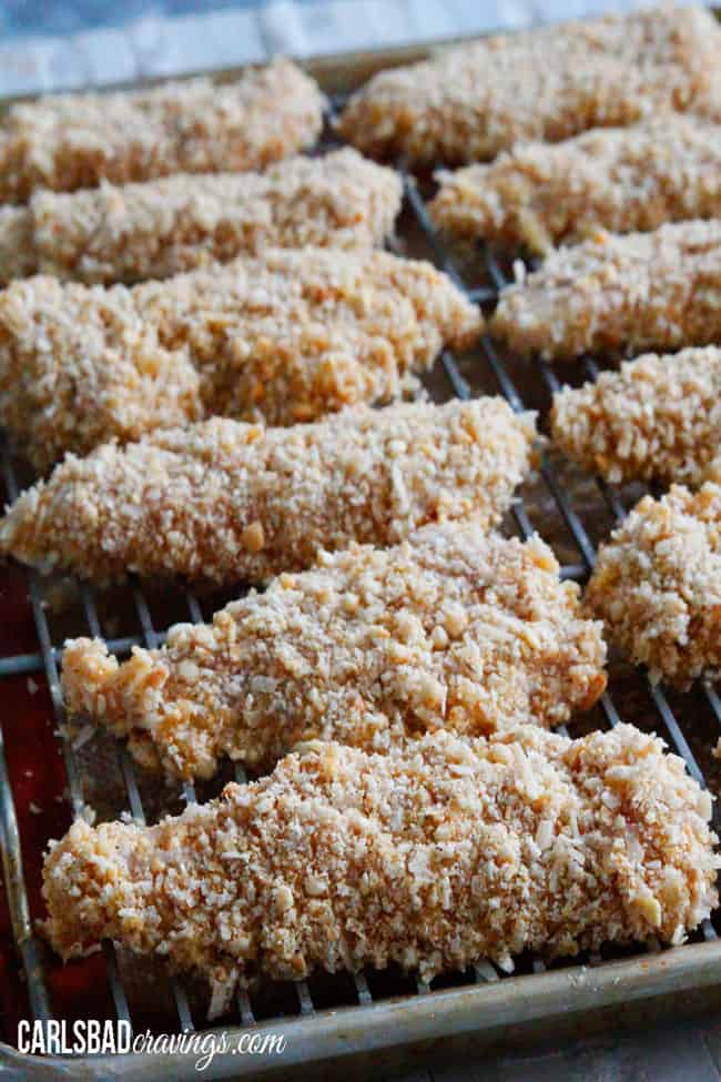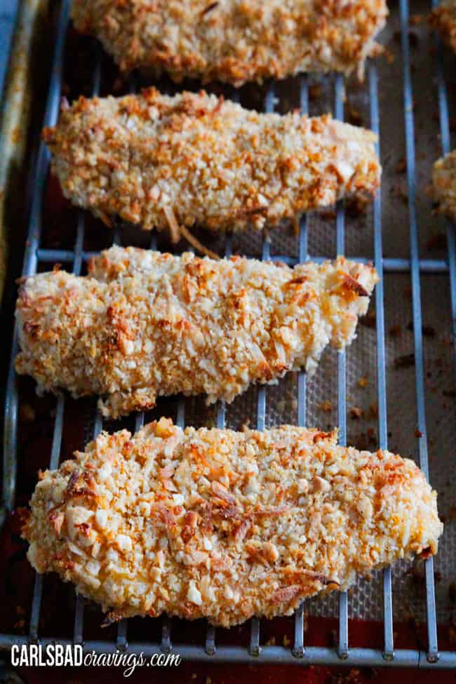 - Bake on a wire rack.ย If you donโt have wire rack, then lightly grease foil and place in the oven to get nice and hot while you prep the chicken.ย Take care when adding your coconut crusted chicken because your pan will be HOT!