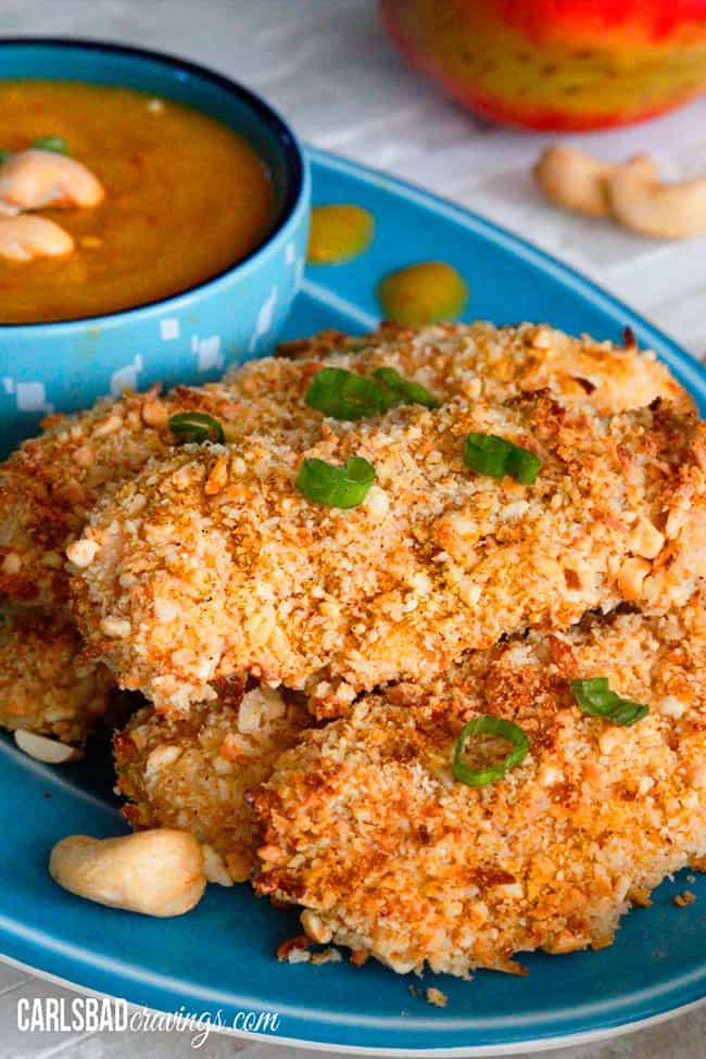 ย This crunchy, Coconut Crusted Chicken recipe is one of the best Iโve created โ I hope youโll agree!ย Every bite of chicken is crusted in cashews, coconut and panko spiced with ginger, cayenne (as little or as much as you like) garlic and onion and sweetened with the coconut and brown sugar. ย These Crispy Coconut Crusted Chickens Tenders are a perfect blend of sweet and spice, crunchy outside, tender inside; ย and the crunchy, buttery cashews just push it over the edge. ย Seriously delicious!