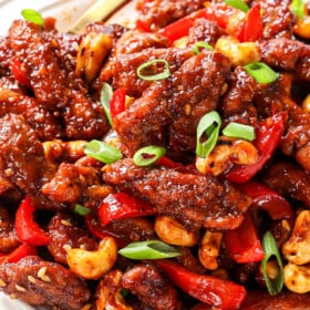Lots of CRUNCH!ย In addition to the crispy, spicy chicken, this recipe is brimming with toasted cashews, stir fried onions and bell peppers for satisfying crunch and texture in every bite.