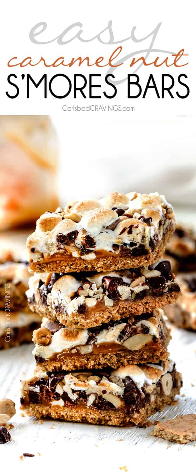 Sโmores Bars are everything you love about gooey, chocolate, marshmallow sโmores but with CARAMEL and your favorite nuts (like cashews โ mmmm) and bonus โ they areย SUPER easy AKA great for crowds!