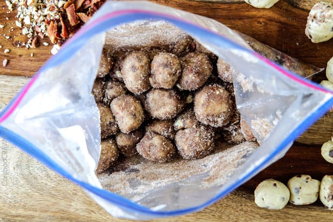 - Coat dough balls in crispy coating.ย Then toss the buttery maple cinnamon roll dough balls in some cinnamon and sugar and finely crushed pecans and bacon.