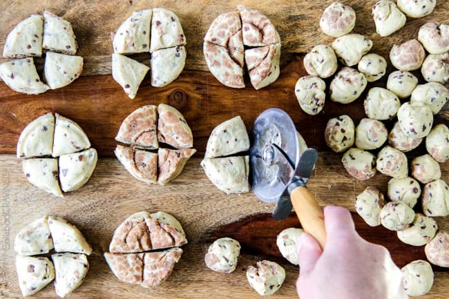 - Cut each cinnamon roll into 4 quarters, then roll each quarter into a ball.