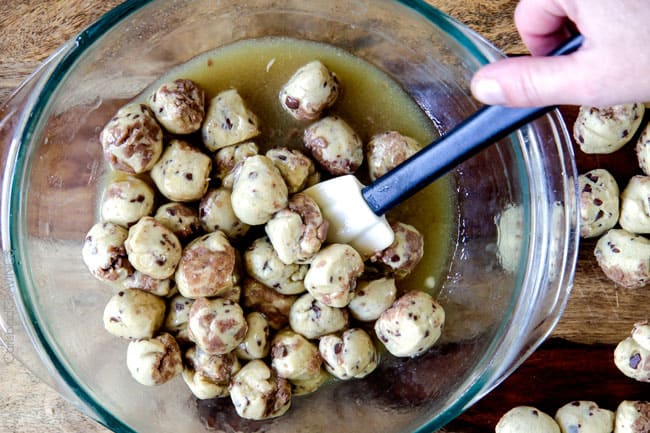 - Coat dough balls in butter. Roll the mini cinnamon rolls in a mixture of butter and pure maple syrup.